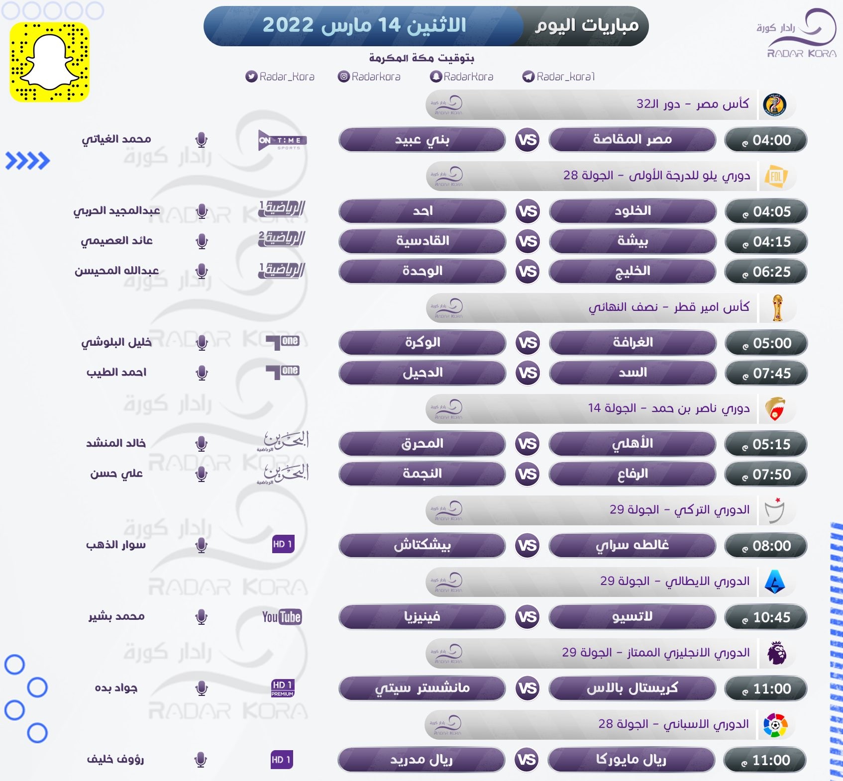 ويترقب عشاق الدوري الإنجليزي مباراة كريستال بالاس مع مإنشستر سيتي في اختتام منافسات الجولة 29 من البطولة، أما في الدوري الإسباني فيلعب ريال مايوركا مع ريال مدريد بالأسبوع 28 للمسابقة.