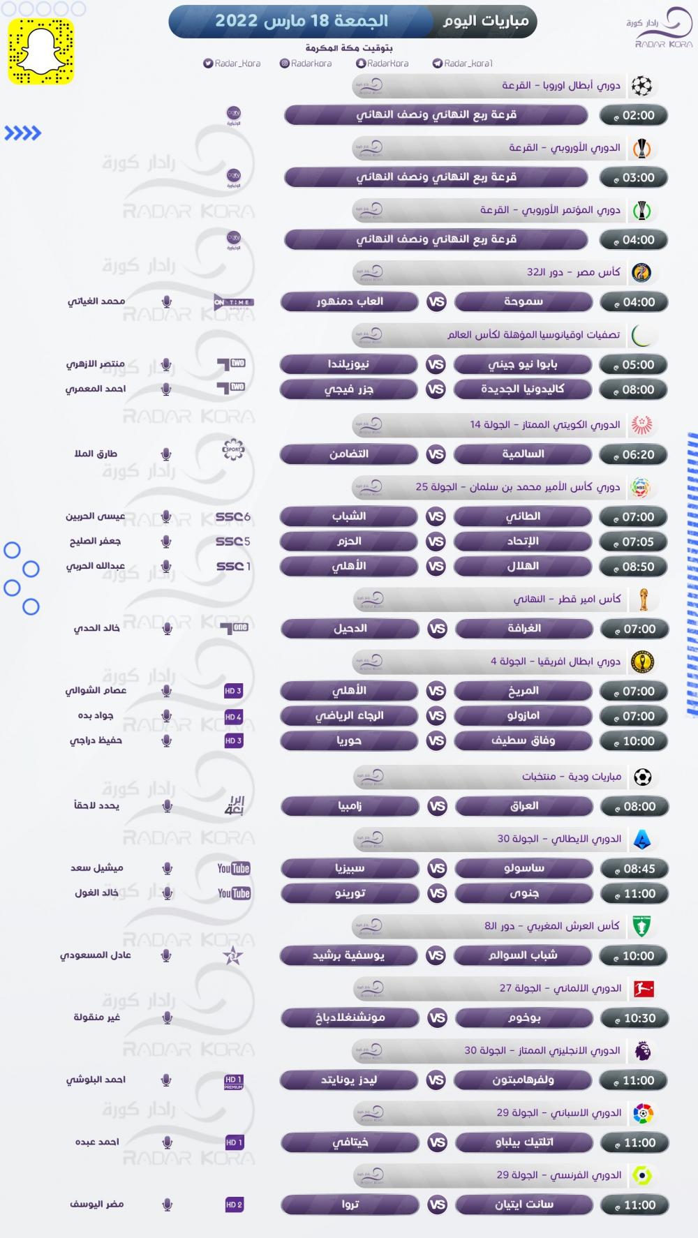 تتجه أنظار عشاق كرة القدم اليوم الجمعة لمباريات أبطال إفريقيا، والدوري السعودي، وقرعة الأدوار ربع، ونصف النهائي للبطولات الأوروبية القارية بكرة القدم.