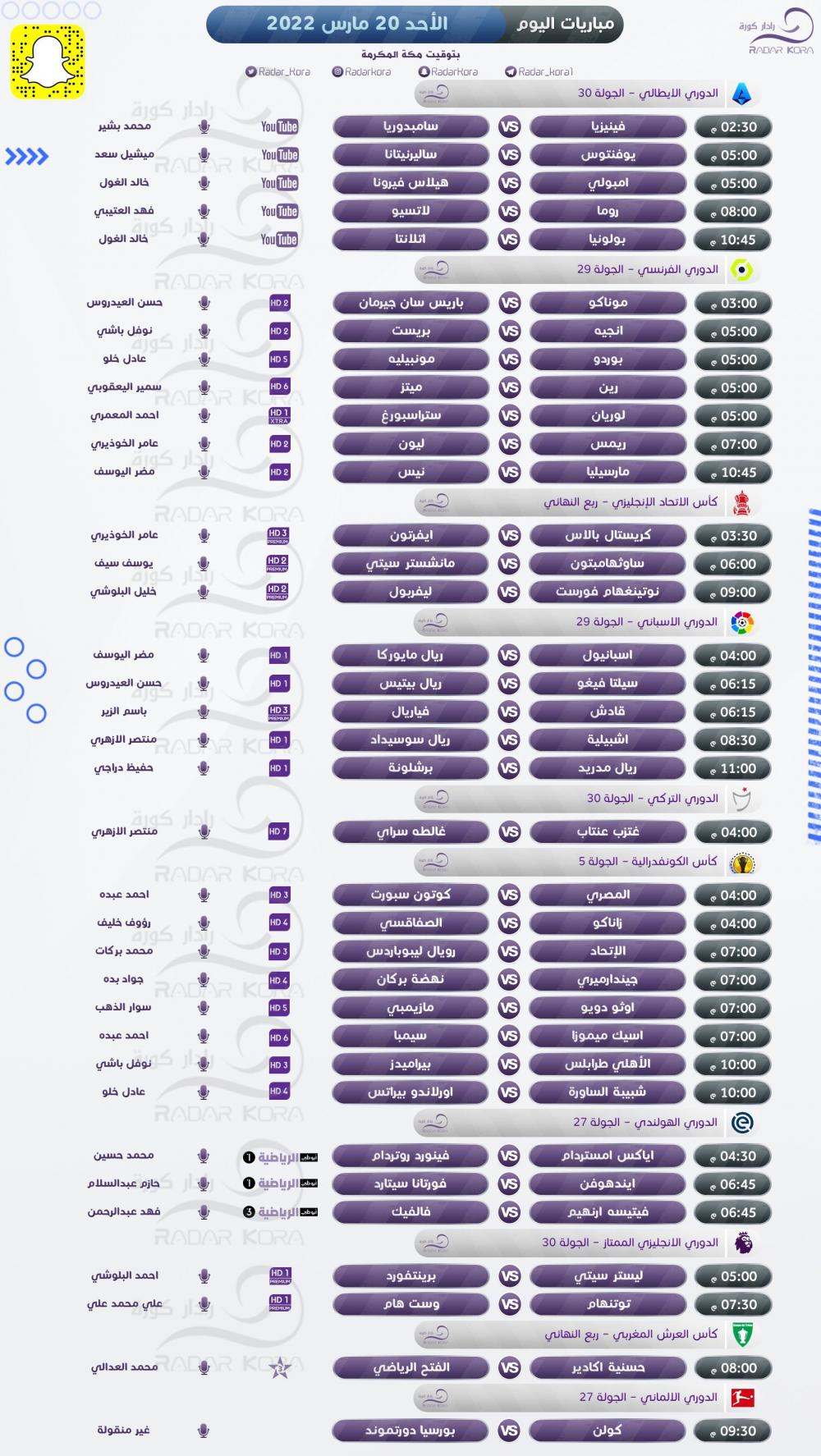 تتجه أنظار عشاق كرة القدم اليوم الأحد لعدة مباريات في الدوريات، والكؤوس الأوروبية، وبطولة الكونفدرالية الإفريقية.