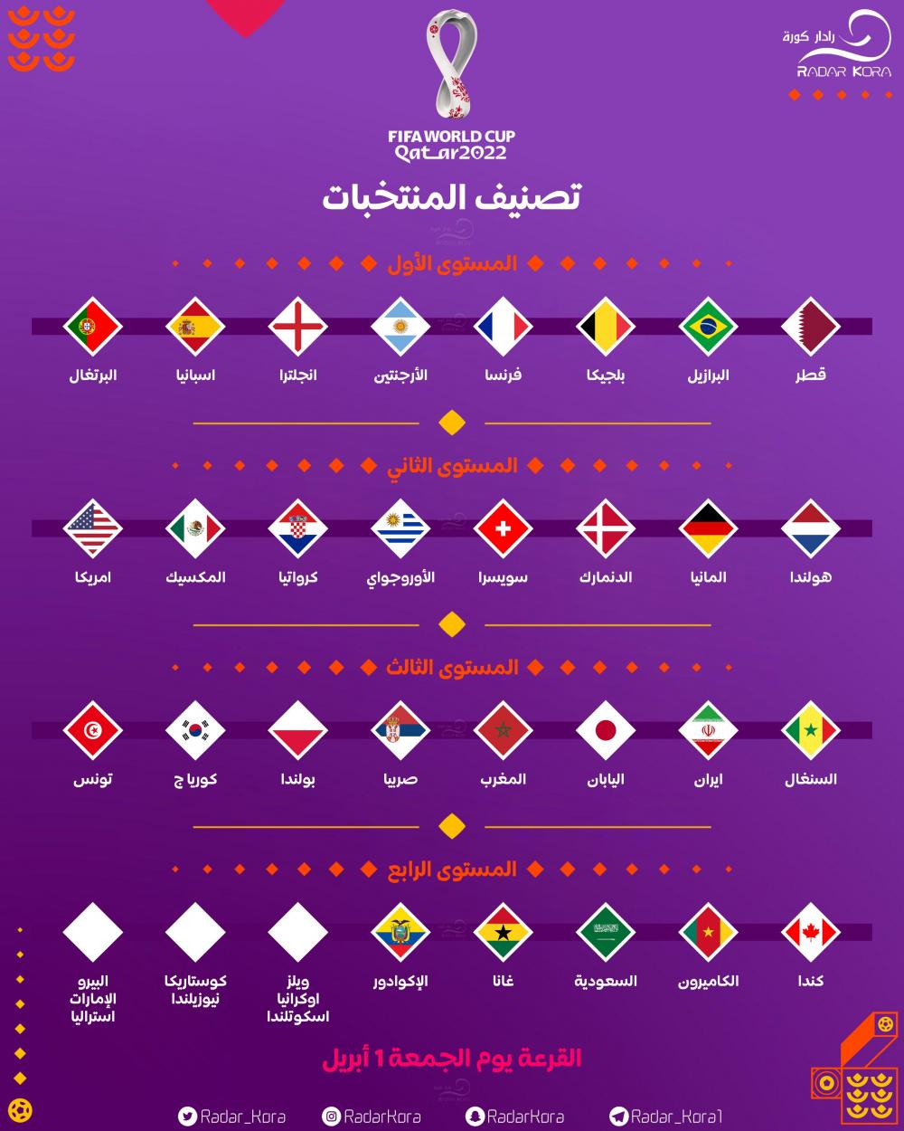 وستكون قطر ضمن المستوى الأول باعتبارها مستضيفة للمونديال، فيما أتى كل من المنتخب المغربي، والمنتخب التونسي في المستوى الثالث، ومنتخب السعودية بالمستوى الرابع.