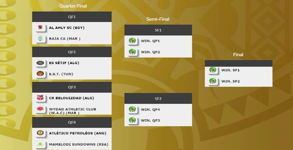 وبتقابل في الدور نصف النهائي الفائز من مباراة الأهلي والرجاء مع المتأهل من لقاء وفاق سطيف والترجي، ويلعب الصاعد من مواجهة شباب بلوزداد والوداد مع الفائز من لقاء بترو أتلتيكو وصن داونز.
