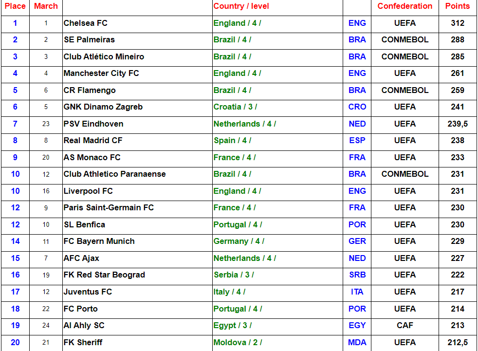 وتصدر تشيلسي الإنجليزي قائمة أفضل الأندية في العالم، وجاء بالميراس البرازيلي ثانيًا، يليه مواطنه أتلتيكو مينيرو في المركز الثالث، ثم مانشستر سيتي الإنجليزي رابعًا.