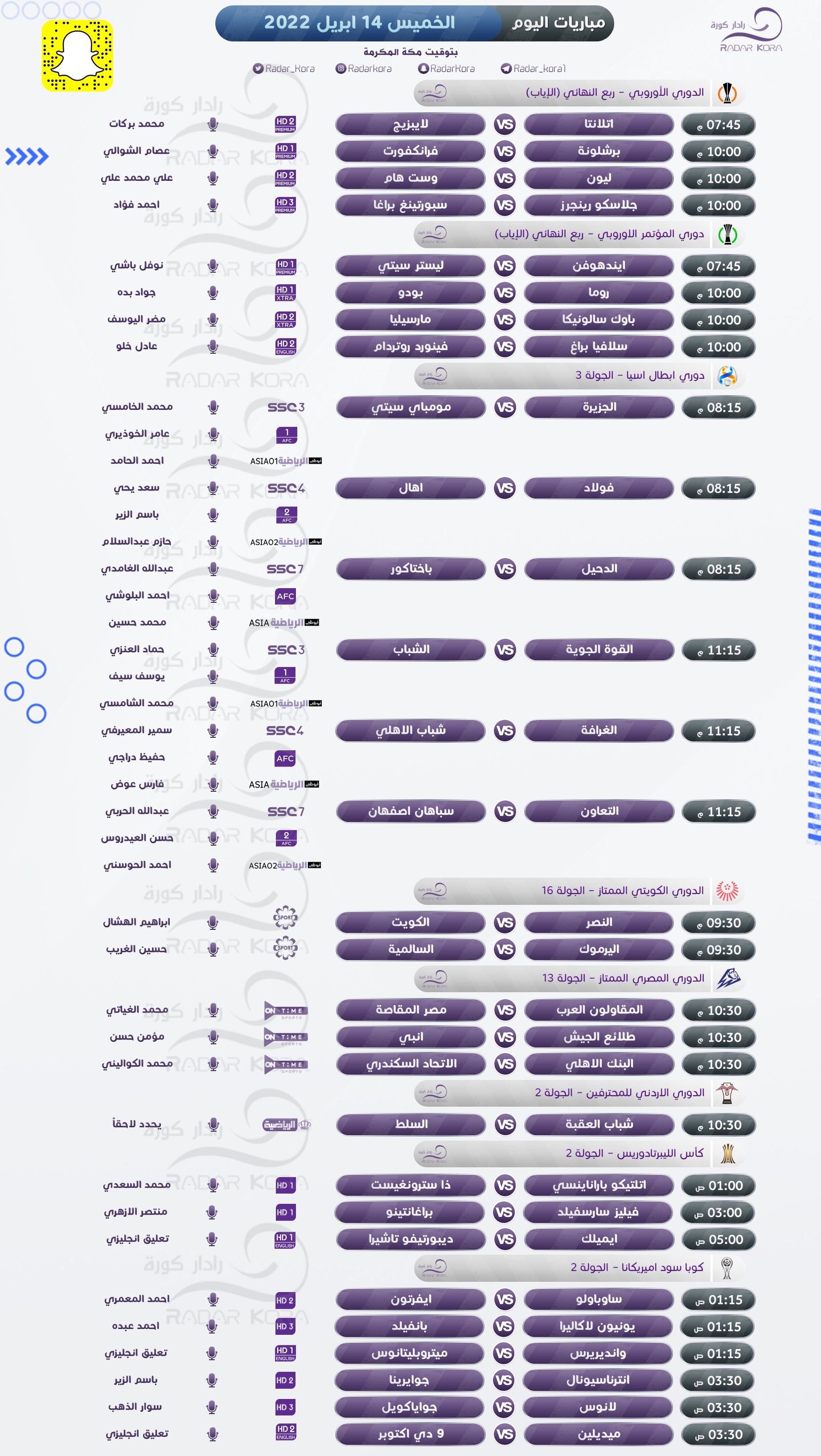 تتجه أنظار عشاق كرة القدم اليوم الخميس لمباريات إياب الدور ربع النهائي من الدوري الأوروبي، ودوري المؤتمر الأوروبي، ومرحلة المجموعات من دوري أبطال أسيا.