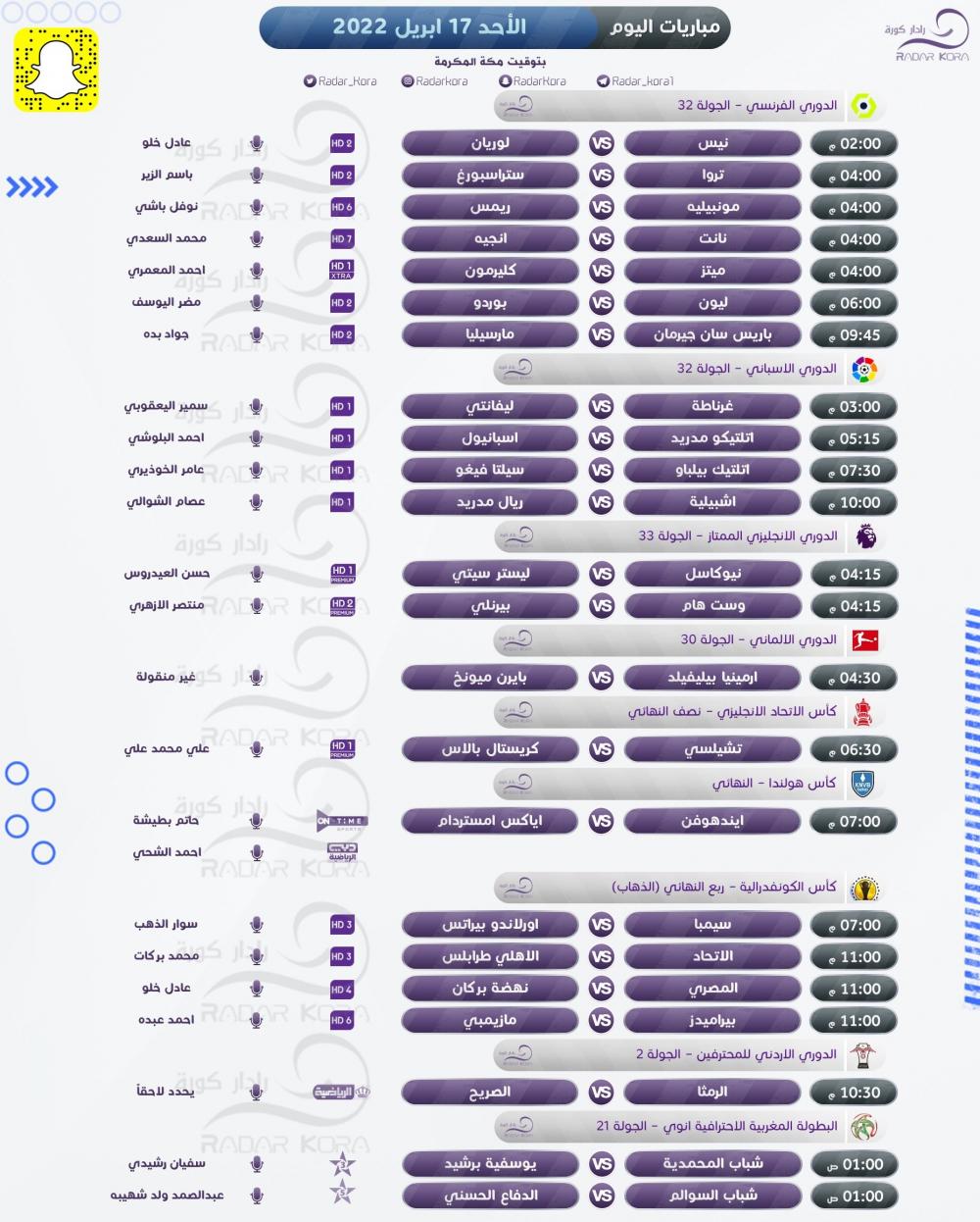 تتجه أنظار عشاق كرة القدم اليوم الأحد لعدة مباريات في الدوريات، والكؤوس الأوروبية، الكونفيدرالية الإفريقية.