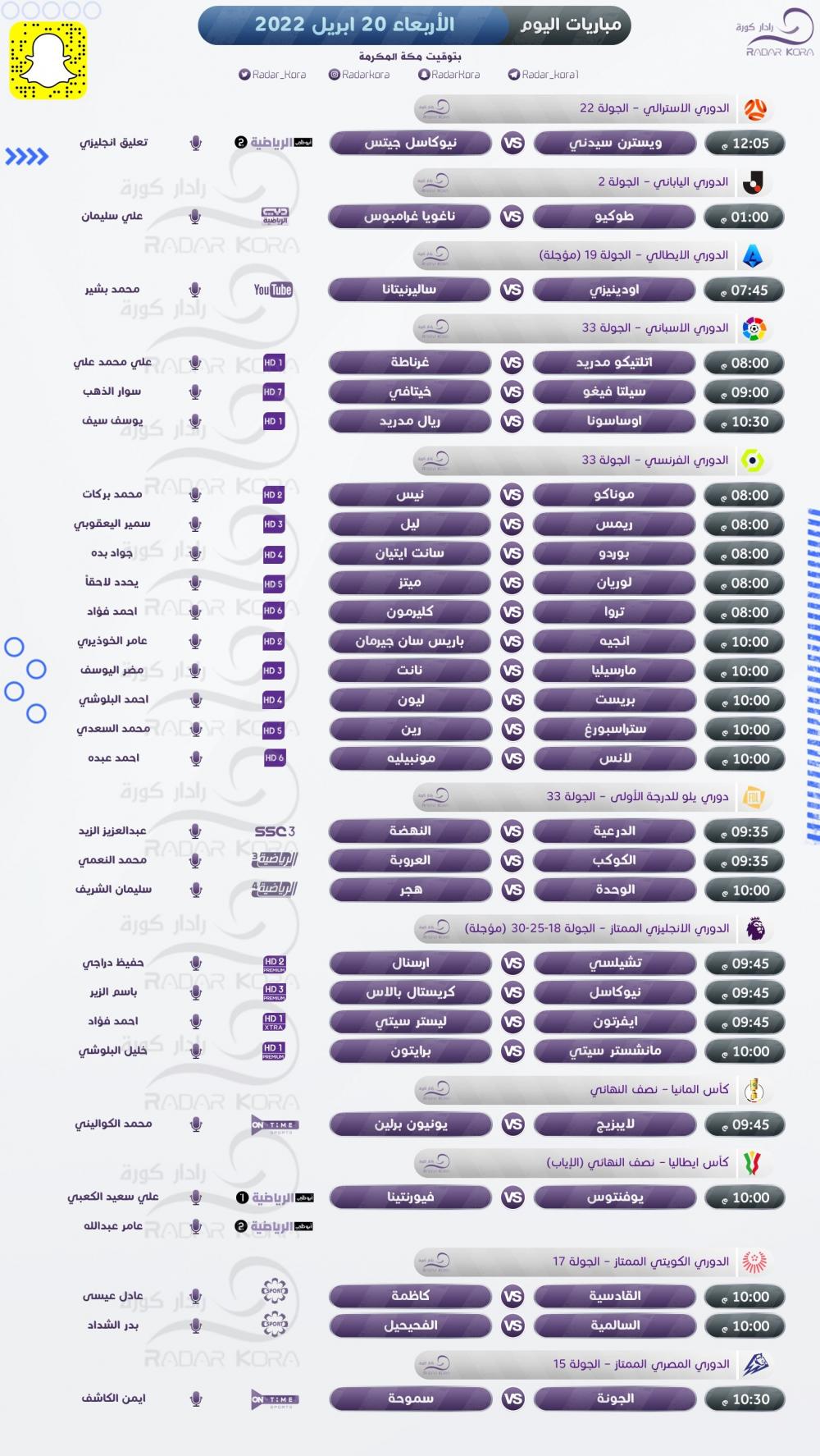 ويتقابل بإياب نصف نهائي كأس إيطاليا يوفنتوس مع فيورنتينا، وفي مباراة بارزة مؤجلة من الأسبوع 25 للدوري الإنجليزي الممتاز يلعب تشيلسي مع أرسنال، ويتقابل مانشستر سيتي مع برايتون بلقاء مؤجل من الجولة 30، أما في الدوري الإسباني يتواجه أوساسونا مع ريال مدريد، وأتلتيكو مدريد مع غرناطة ضمن مباريات المرحلة 33، وفي أبرز مباريات الأسبوع 33 من الدوري الفرنسي يتواجه أنجبه مع باريس سان جيرمان، ومارسيليا مع نانت.