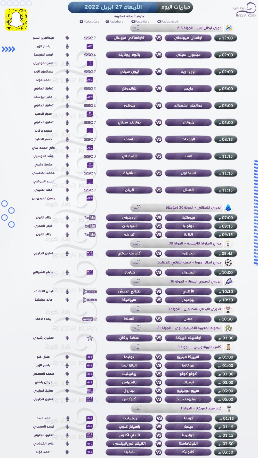 تتجه الأنظار مساء اليوم الأربعاء لمباراة ذهاب الدور نصف النهائي من أبطال أوروبا، ودور الإقصائيات لأبطال أسيا، والدوري الإيطالي، والمصري لكرة القدم.