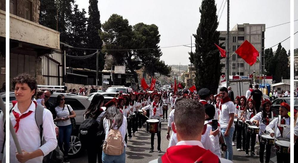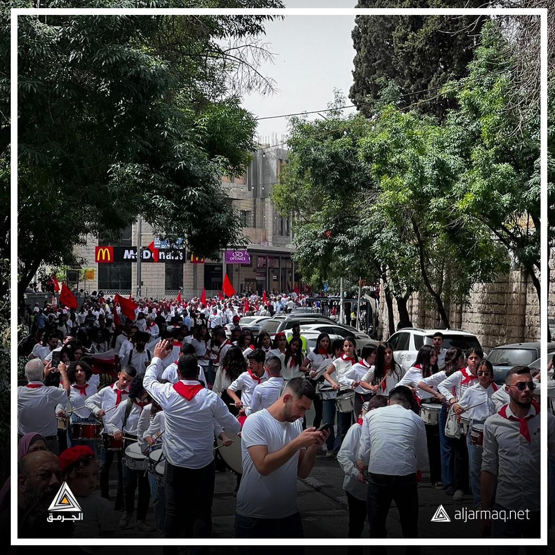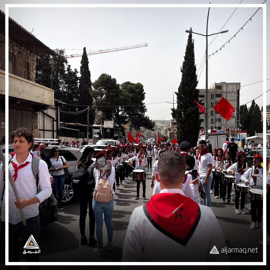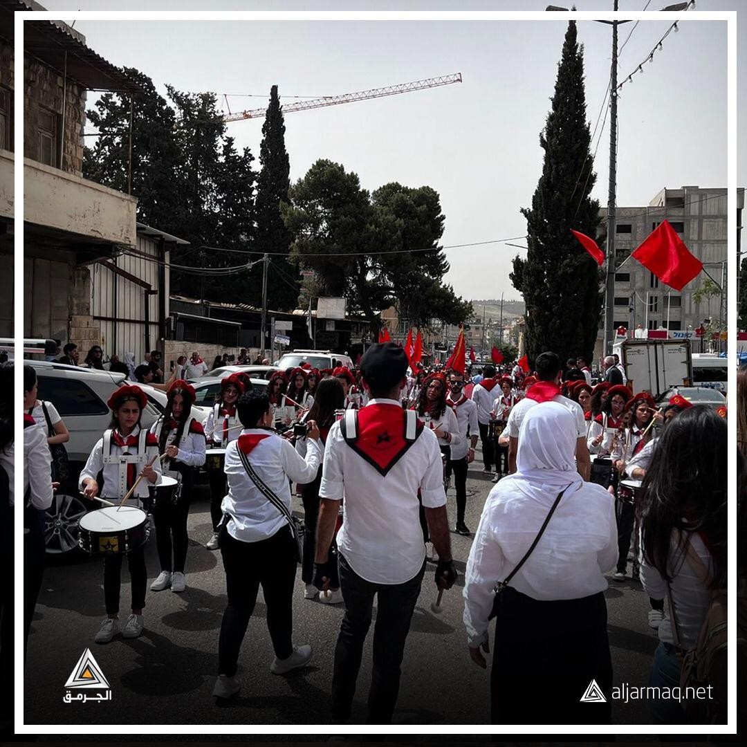 وجابت المسيرة، أحياء المدينة وشوارعها، حيث رفع المشاركون فيها الأعلام الحمراء والأعلام الفلسطينية، واليافطات التي خطت عليها شعارات مثل: "القدس عاصمة فلسطين الأبدية"، و "يا عمال العالم اتحدوا"، و"الاحتلال أساس البلاء".