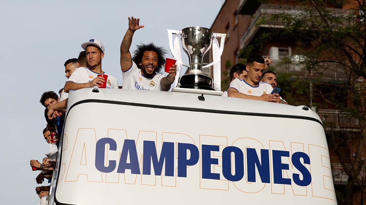 ظهر البرازيلي مارسيلو قائد فريق ريال مدريد الإسباني سعيدًا في ساحة "سيبيليس" مقر احتفالات الفريق "الملكي" بعد الفوز بلقب الدوري مساء السبت، مشيرًا إلى أن الجميع ينتظر مواجهة مانشستر سيتي الإنجليزي يوم الأربعاء المقبل.