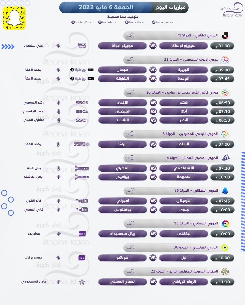 وتنطلق مباريات الجولة 36 من الدوري الإيطالي بمباراة إنتر ميلان مع إمبولي، وجنوى مع يوفنتوس، وفي المرحلة 26 من دوري كأس الأمير محمد بن سلمان "الدوري السعودي للمحترفين" يلعب الفتح مع الاتحاد، وأبها مع الفيصلي، والنصر مع الشباب، أما في الجولة 14 من الدوري المصري يتقابل الإسماعيلي مع المصري البور سعيدي، وسموحة مع بيراميدز.