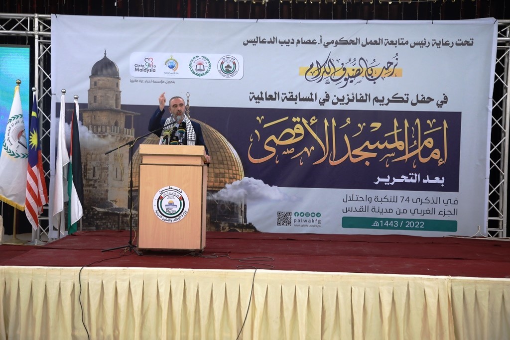 بدوره، قال وكيل وزارة الأوقاف: إننا "نعقد الآمال ونبني الثقة بوعد الله بأن المستقبل لهذا الدين وموعدنا قريب في ساحات المسجد الأقصى، نلتقي بين الالم والامل المنبعث من ذكرى النكبة الرابعة والسبعين ونستحضر كل صور التهجير واللجوء وصور أجدادنا وآبائنا الذين عانوا جراء اغتصاب العدو لهذه الأرض والأمل المنبعث من ذكرى سيف القدس ومسابقة إمام المسجد الأقصى بعد التحرير".