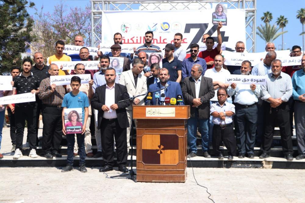 وقال رئيس الهيئة أحمد محيسن في كلمته خلال الوقفة: إن" الشعب الفلسطيني بعد 74 عامًا ما زال يحيى الذكرى الأليمة التي حلت به عام 1948، ويعيش آثارها ويتجرع مرارتها".