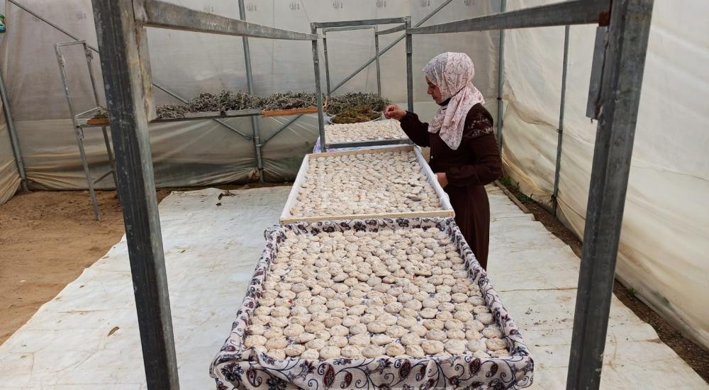 بتركيز وحرص تنهمك غالية أبو سعادة، الأم لخمسة أطفال، في إعداد "الكِشك المُجفف" وتجهيزه للتسويق والبيع، بعدما أصبح مصدر رزق رئيس لها ولأسرتها.
