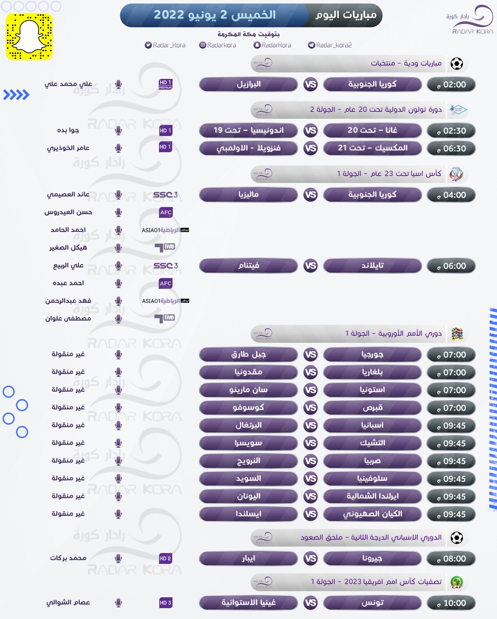 وتشهد تصفيات بطولة كأس أمم إفريقيا مواجهة تونس مع غينيا الإستوائية، وموزمبيق مع رواندا، وفي مباريات ودية تلعب كوريا الجنوبية مع البرازيل، واليابان مع باراجواي.