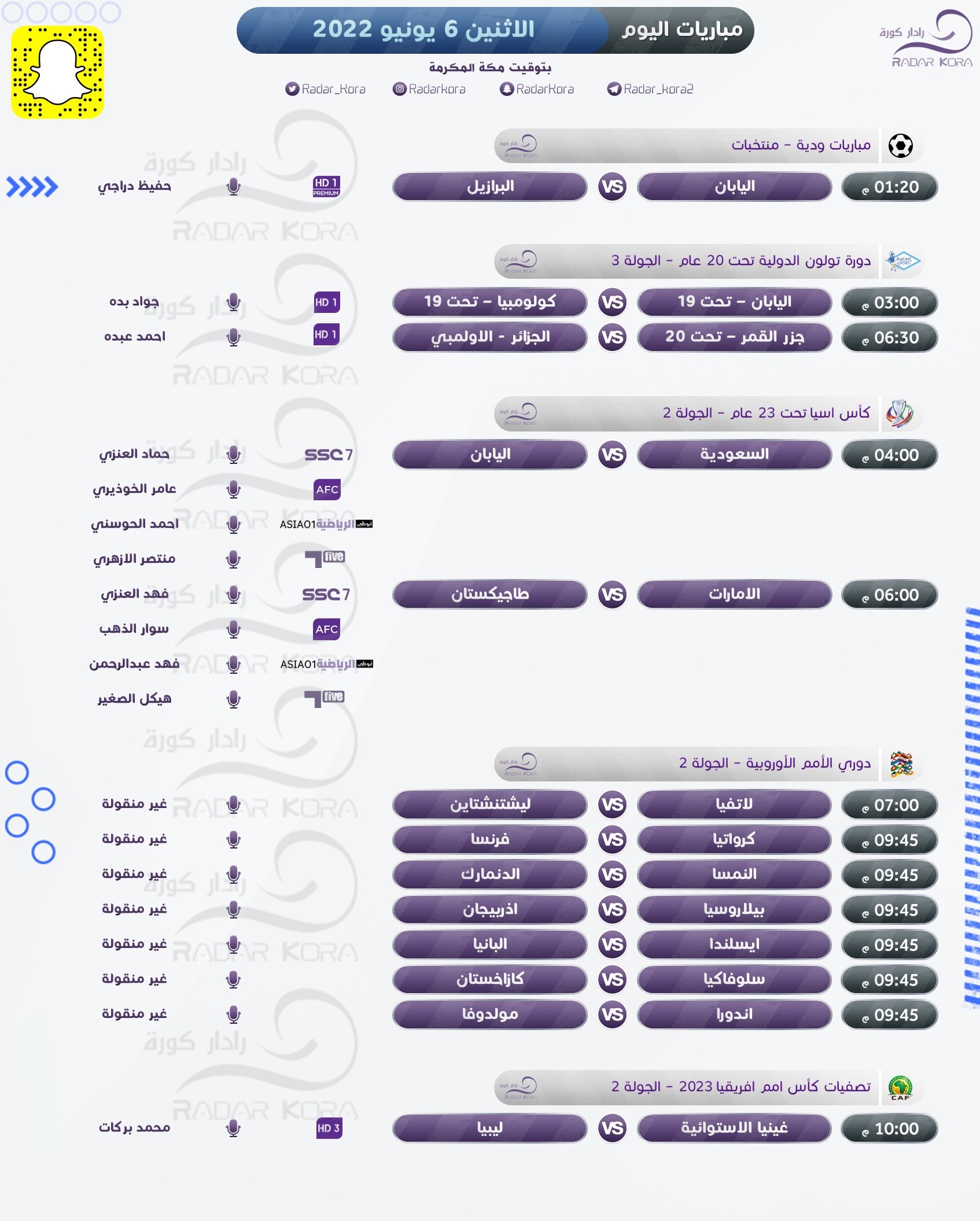 وتشهد تصفيات بطولة كأس أمم إفريقيا مواجهة غينيا الإستوائية مع ليبيا، وفي مباريات ودية تلعب كوريا الجنوبية مع تشيلي، واليابان مع البرازيل.