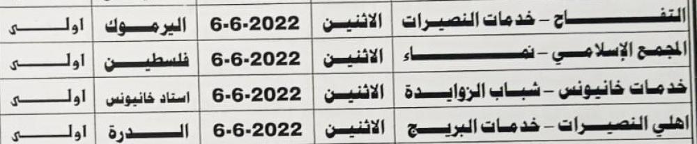 ويتقابل خدمات خانيونس مع شباب الزوايدة، والتفاح مع خدمات النصيرات، وأهلي النصيرات مع خدمات البريج، والمجمع الإسلامي مع نماء.