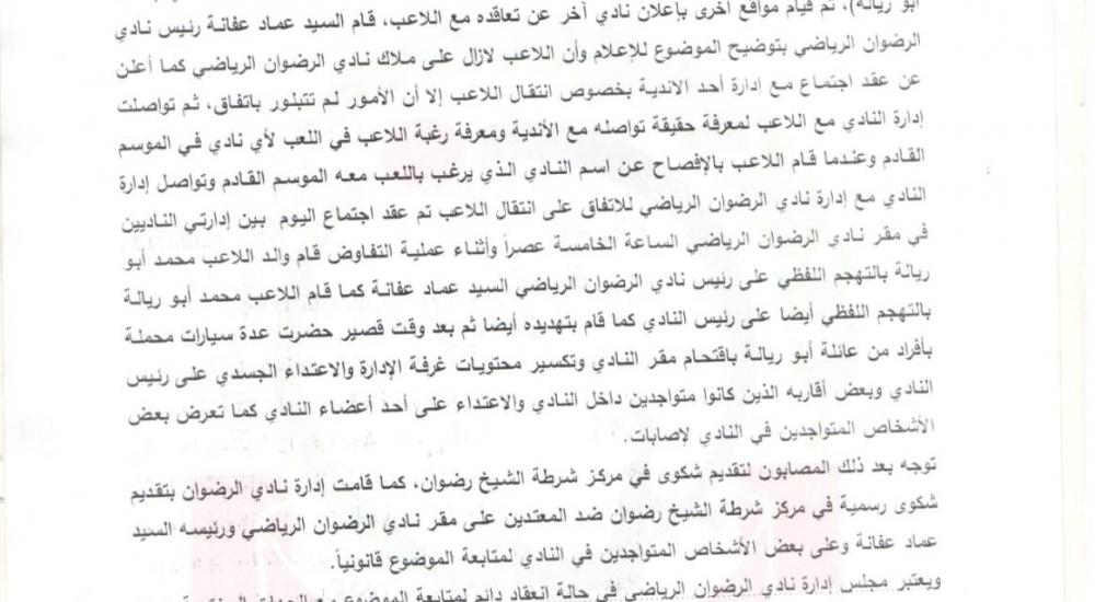 وأكد النادي في بيان له وصل وكالة الصحافة الفلسطينية "صفا" نسخة منه أن عفانة فوجئ بالهجوم على مقر النادي خلال التفاوض مع اللاعب محمد أبو ريالة على خروجه من النادي على سبيل الإعارة.