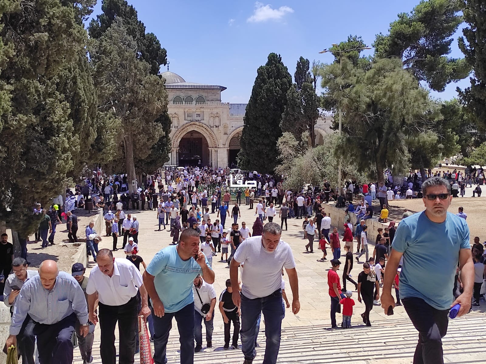 وشهدت ساحات المسجد الأقصى توافد أعداد كبيرة من المصلين، من أهالي القدس والداخل الفلسطيني المحتل، وممن استطاع الوصول من الضفة الغربية.