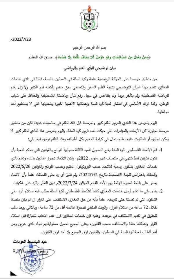 وأكد المغازي أنه وبسبب سلب الحقوق على حد وصف البيان، فقد قرر عدم الذهاب للمباراة التي تجمع فريقه مع خدمات البريج قبل استلام القرار، واعطاءه الحق بالاستئناف على القرار وفق القانون.