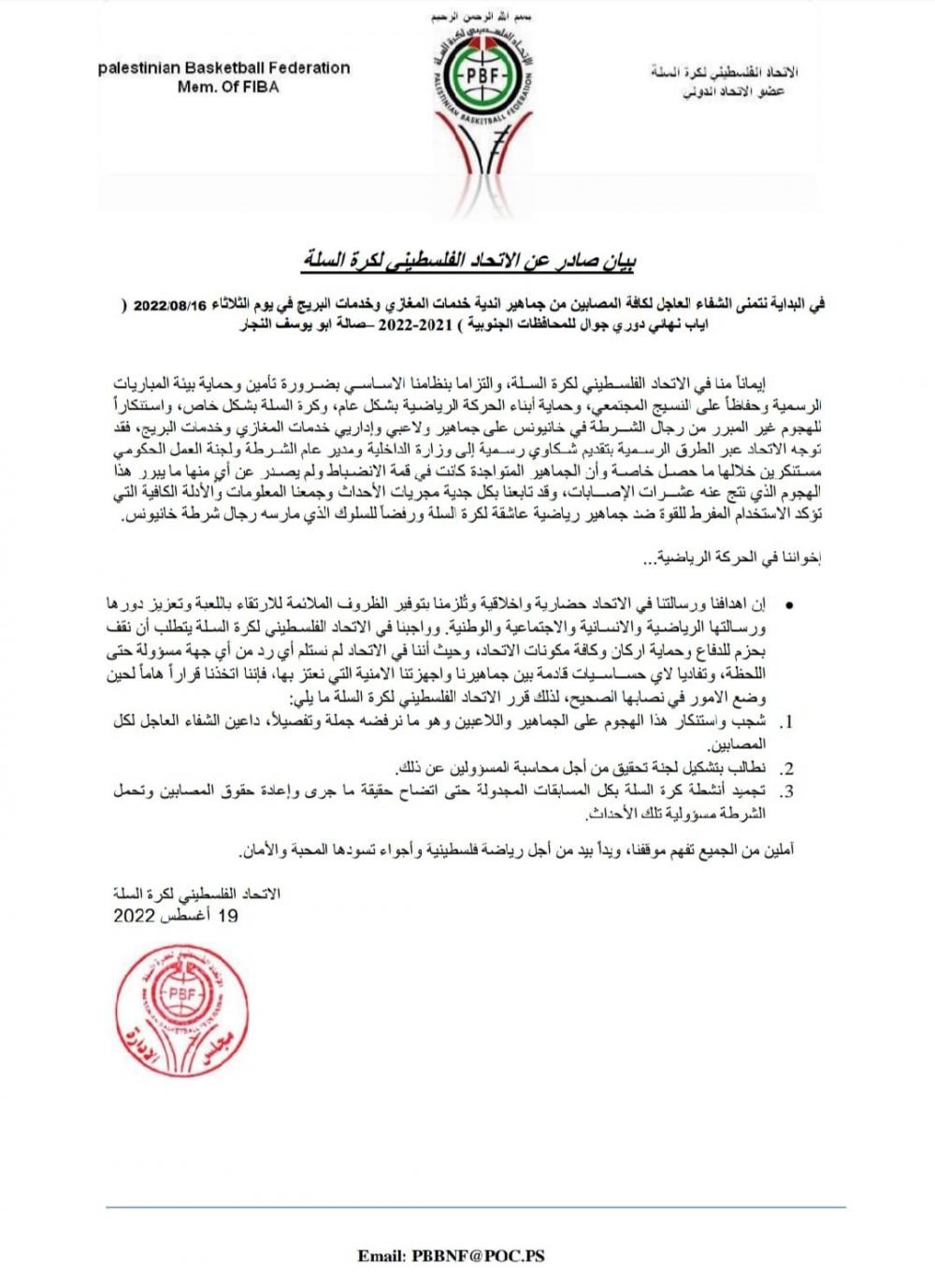 ونوه الاتحاد بأنه طالب اللجنة الأولمبية الفلسطينية للوقوف إلى جانب الاتحاد، لأخذ حقوق كافة المصابين الذين تعرضوا للاعتداء دون أي سبب يذكر.