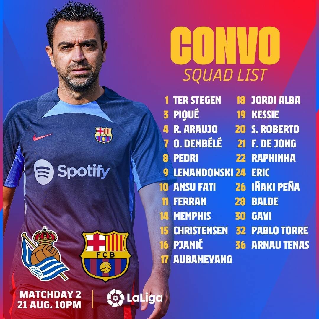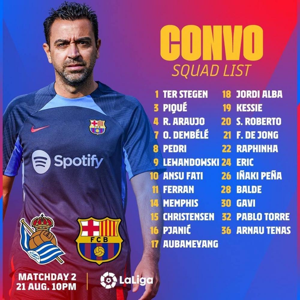 وكشف المدير الفني "للبارسا" تشافي هرنانديز عن قائمة الفريق المستدعاة للمباراة، والتي شهدت استمرار غياب "كوندي" لعدم التسجيل، و"ديست" بقرار فني، و"بوسكيتس" للإيقاف.