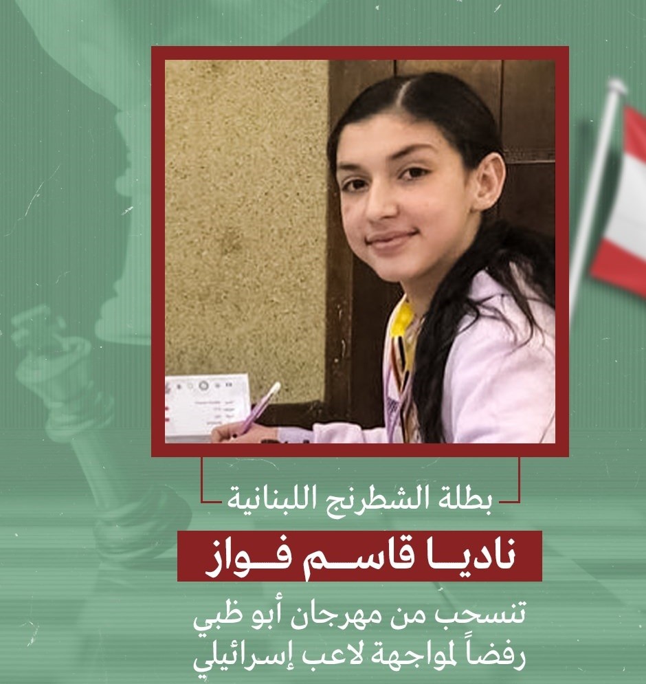 قررت بطلة الشطرنج اللبنانية ناديا قاسم فواز الانسحاب من مهرجان أبو ظبي الدولي الرابع المفتوح، بعدما أوقعها التصنيف في مواجهة لاعب "إسرائيلي" في الجولة الرابعة، لتواصل البطلة اللبنانية السير في طريق أقرانها من أبطال الرياضة اللبنانيين ممن يرفضون التطبيع، ويدعمون القضية الفلسطينية.