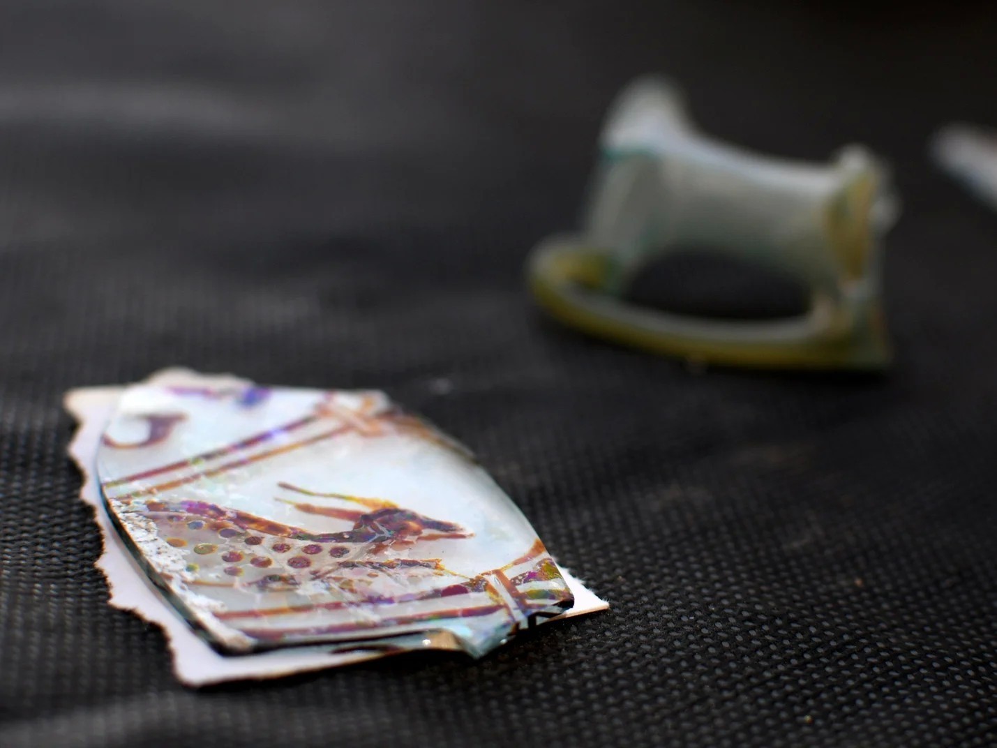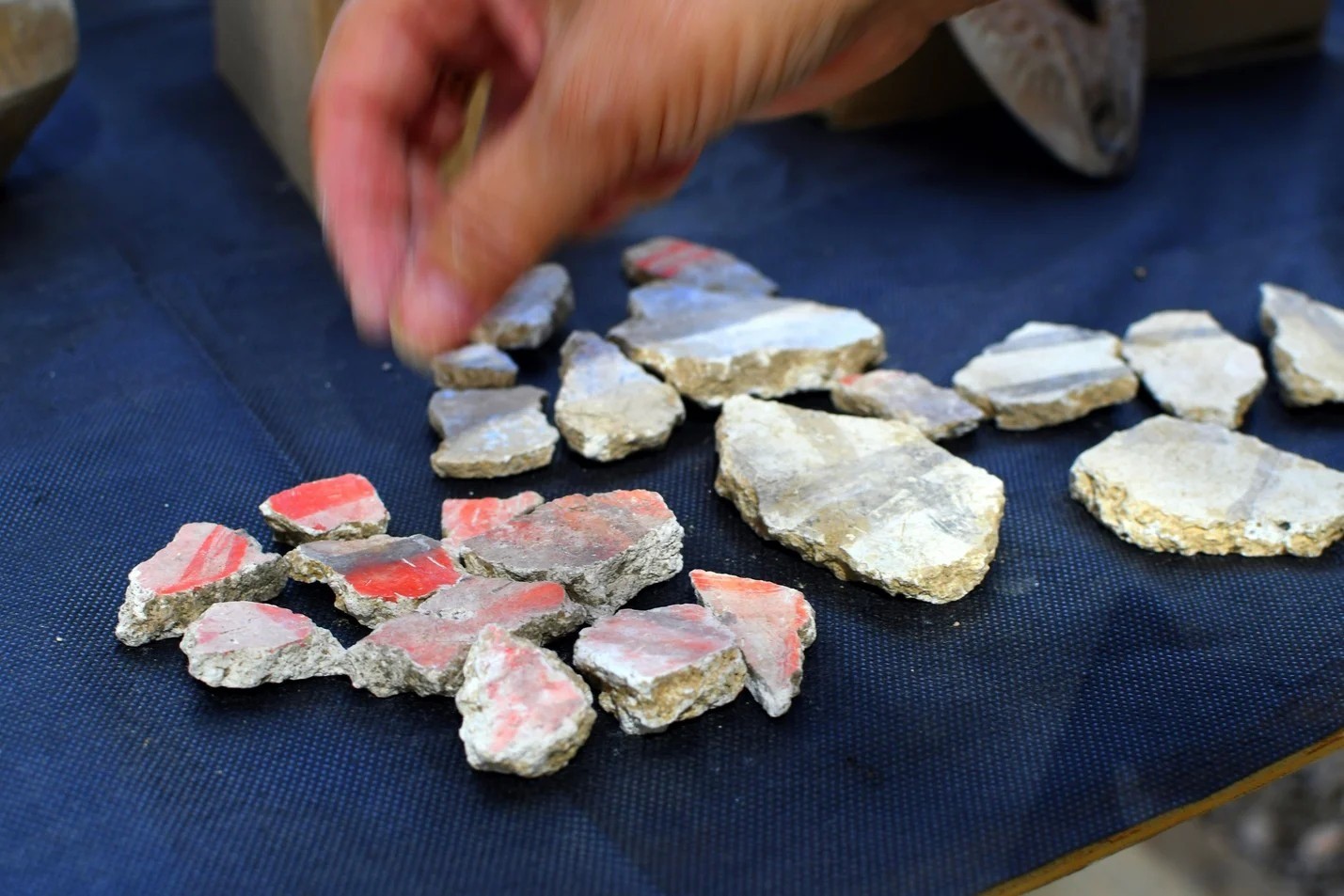 وفي أحد الأجنحة في المبنى المكتشف، كانت هناك قاعة مرصوفة بأرضية رخامية وحجرية وجدران مزينة بلوحات جدارية على جص رطب، وتم تلوين شظايا اللوحات الجدارية الصغيرة الموجودة بدقة، بالألوان الأحمر والأصفر والأزرق والأسود.