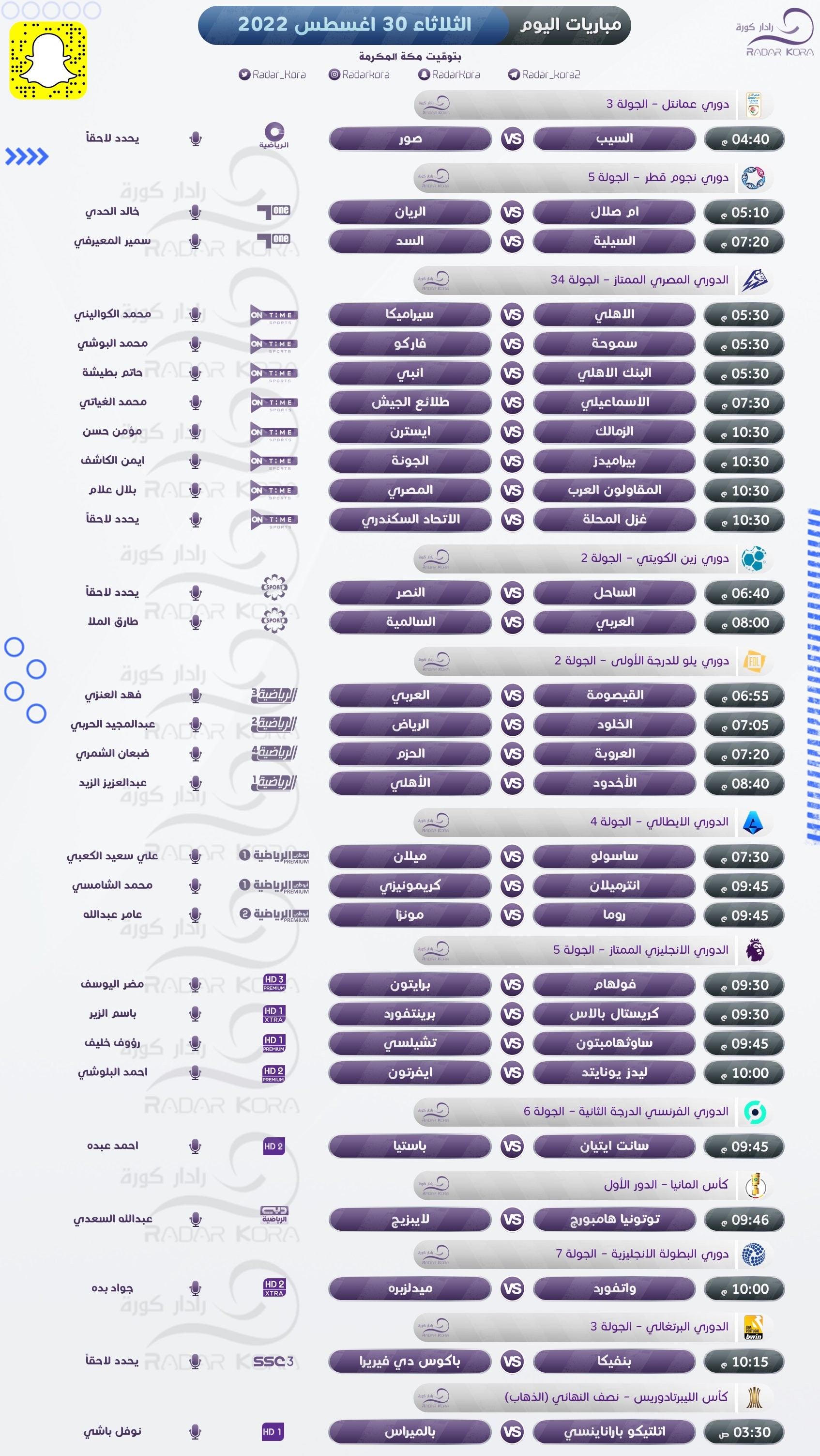 تتجه أنظار عشاق كرة القدم اليوم الثلاثاء لعدة مباريات في الدوريات الأوروبية، والعربية المختلفة.