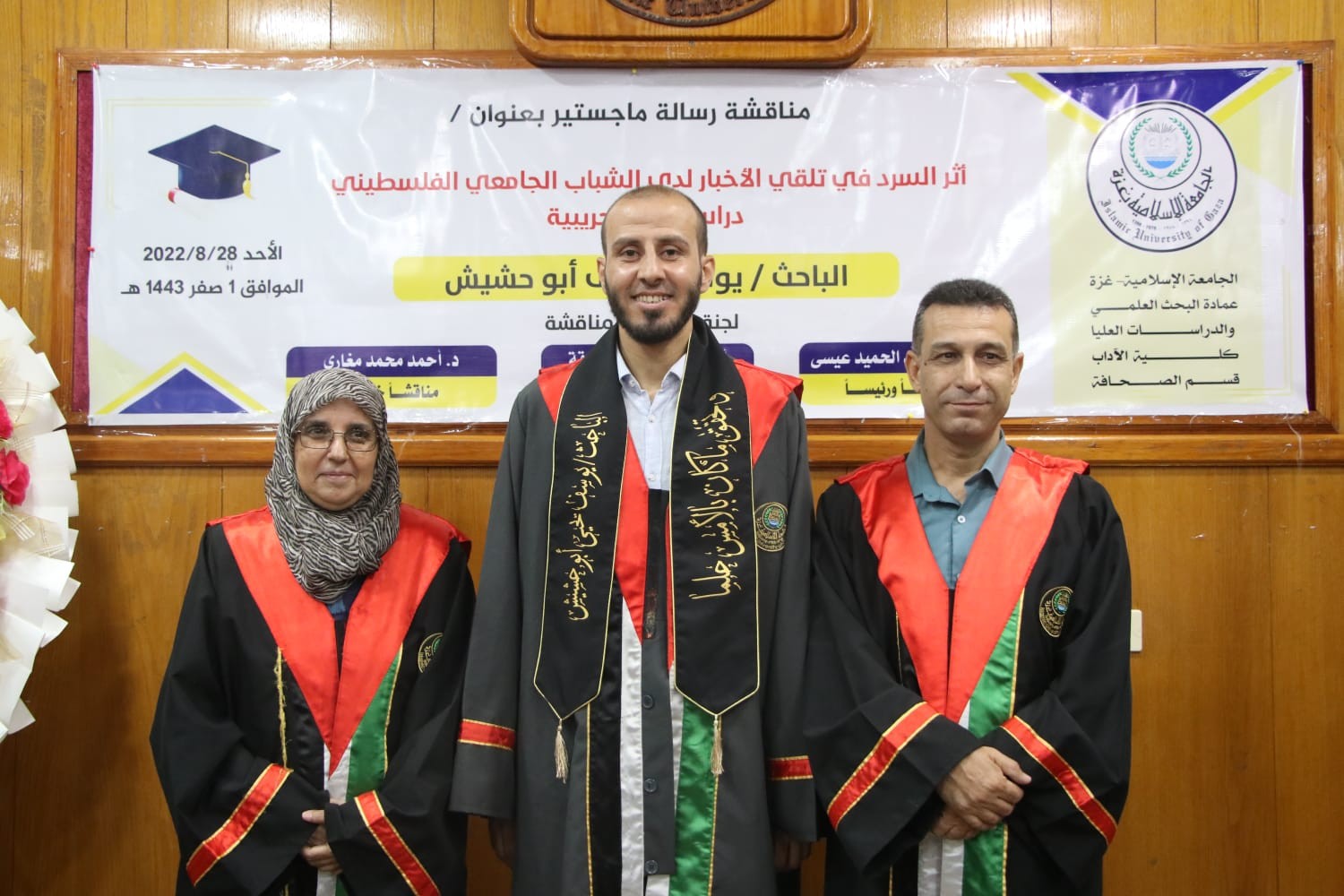 منحت عمادة الدراسات العليا والبحث العلمي بالجامعة الإسلامية بغزة درجة الماجستير للباحث يوسف يحيى أبو حشيش، بعد مناقشة رسالته في الصحافة التي حملت عنوان "أثر السرد في تلقي الأخبار لدى الشباب الجامعي الفلسطيني: دراسة شبه تجريبية".