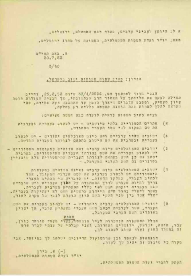 وفي رسالة بتاريخ 4/07/1952 لخص رئيس "لجنة الأسماء الحكومية" أعمالها عبر قرار جاء فيه أنها تستهدف:
