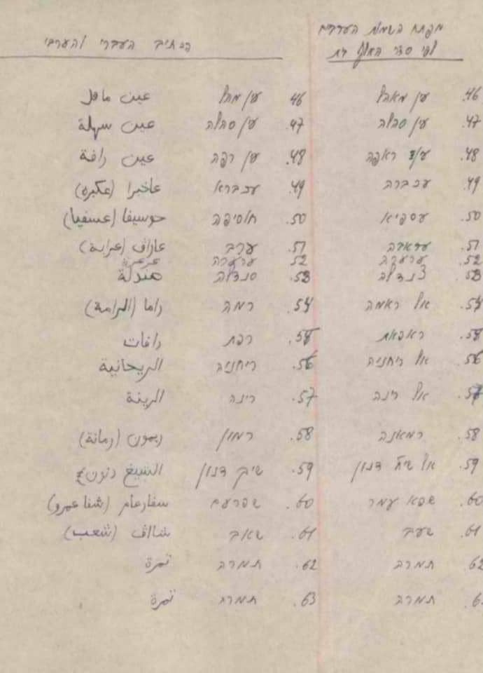 كما جاء في الوثائق أن اللجنة أوصت حينها بتغيير أسماء مدن وبلدات في أراضي 48، مثل: (سخنين: سيكنين)، (إكسال: كسلوت)، (اعبلين: إيفاليم)، (البقيعة: بكيعين)، (صفورية: تسيبوري)، (دبورية: دفورا)، (طرعان: ترعن)، (كفر مندا: (كفار مندي)، (صفد: تسفات) (عرابة: عراف)، (عكا: عكو).