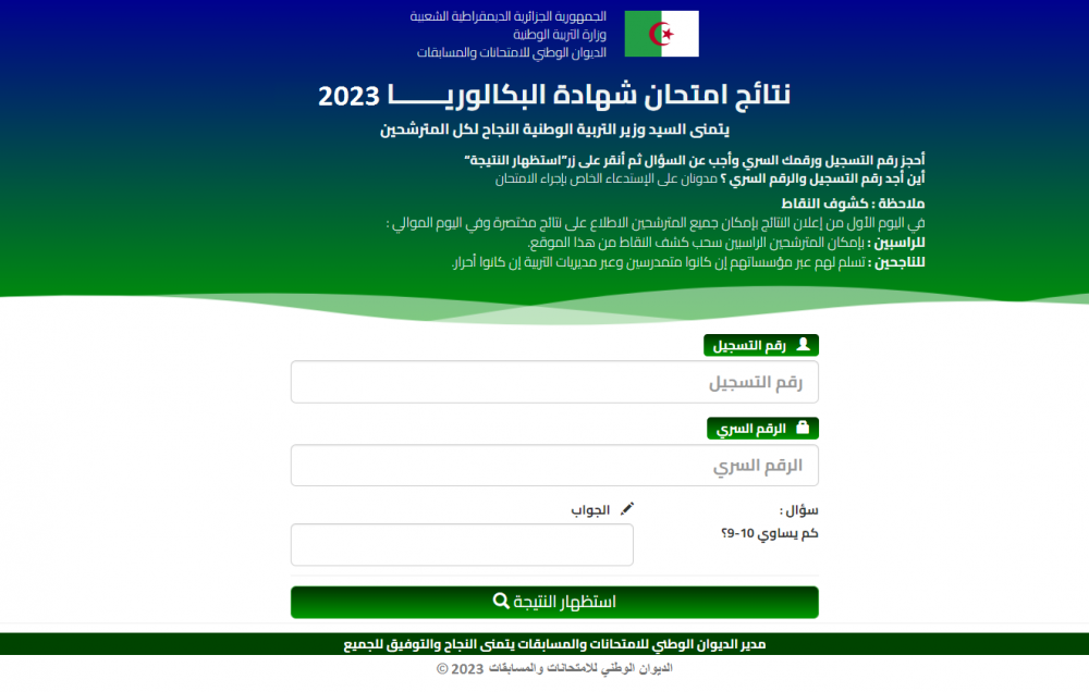 انتهت وزارة التربية الوطنية الجزائرية قبل قليل من كافة أعمال رفع نتائج امتحان شهادة البكالوريا عبر الموقع الرسمي للديوان الوطني للامتحانت والمسابقات، حيث يستطيع كافة الطلاب في معظم المحافظات والمدن الجزائرية الاستعلام عن نتيجة شهادة البكالوريا 2023.