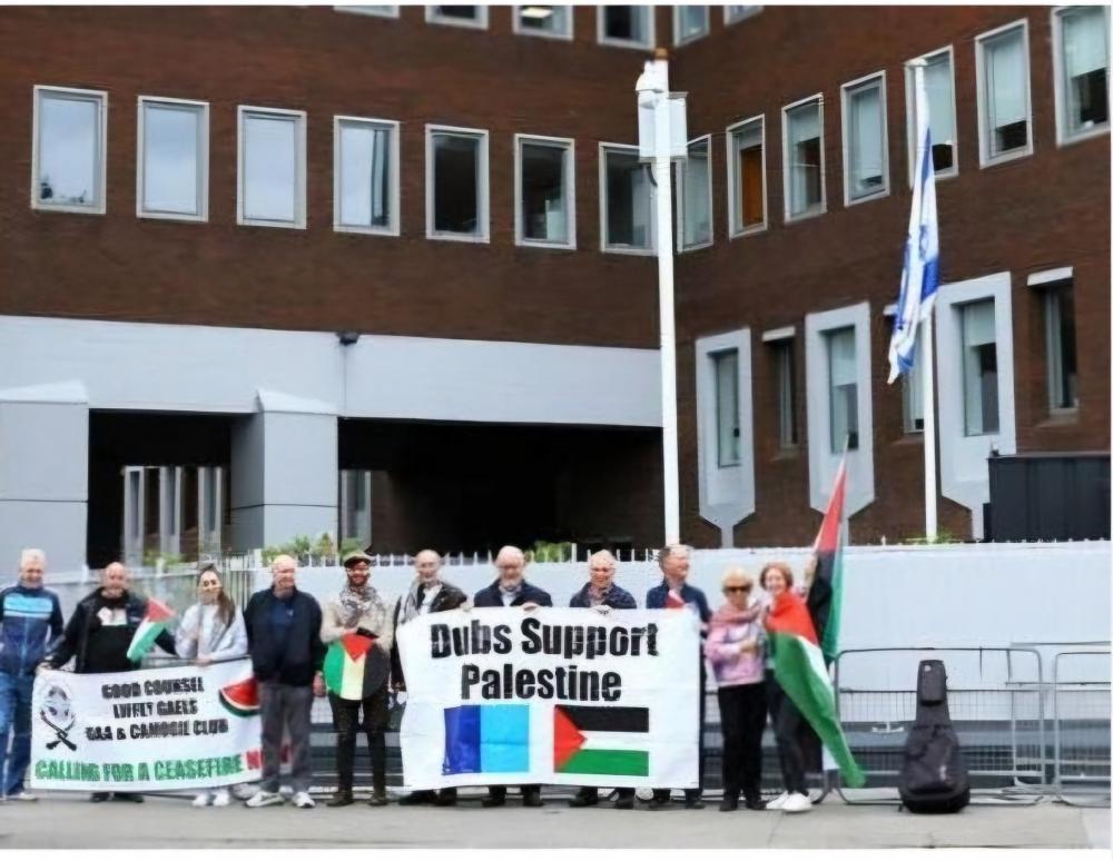 كما تجمع أيرلنديون أمام السفارة الإسرائيلية أثناء إنزال العلم الإسرائيلي تمهيدا لإغلاق المقر.