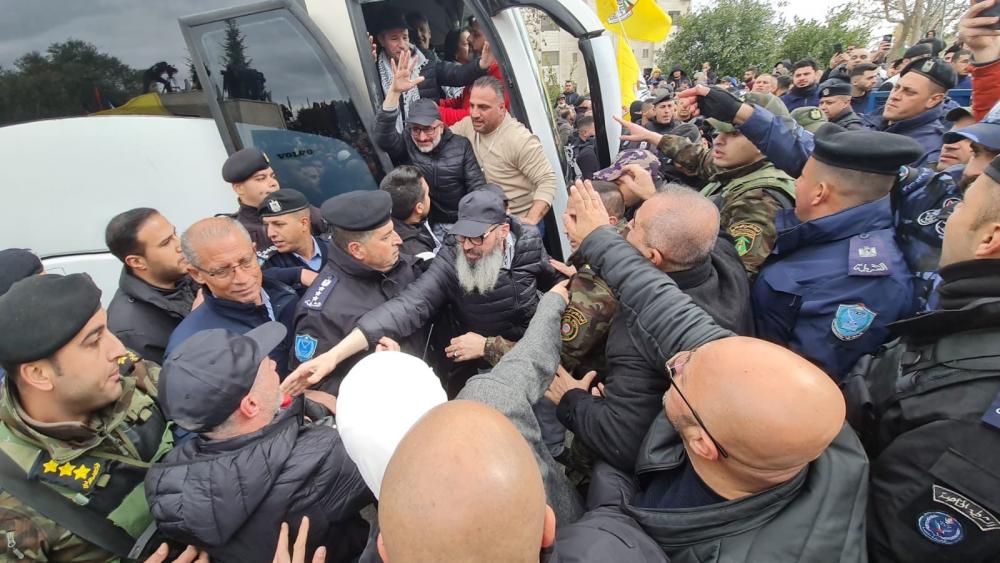ووصلت حافلة تقل الأسرى المحررين من سجن "عوفر" إلى بلدة بيتونيا غرب رام الله وسط استقبال جماهيري مهيب.