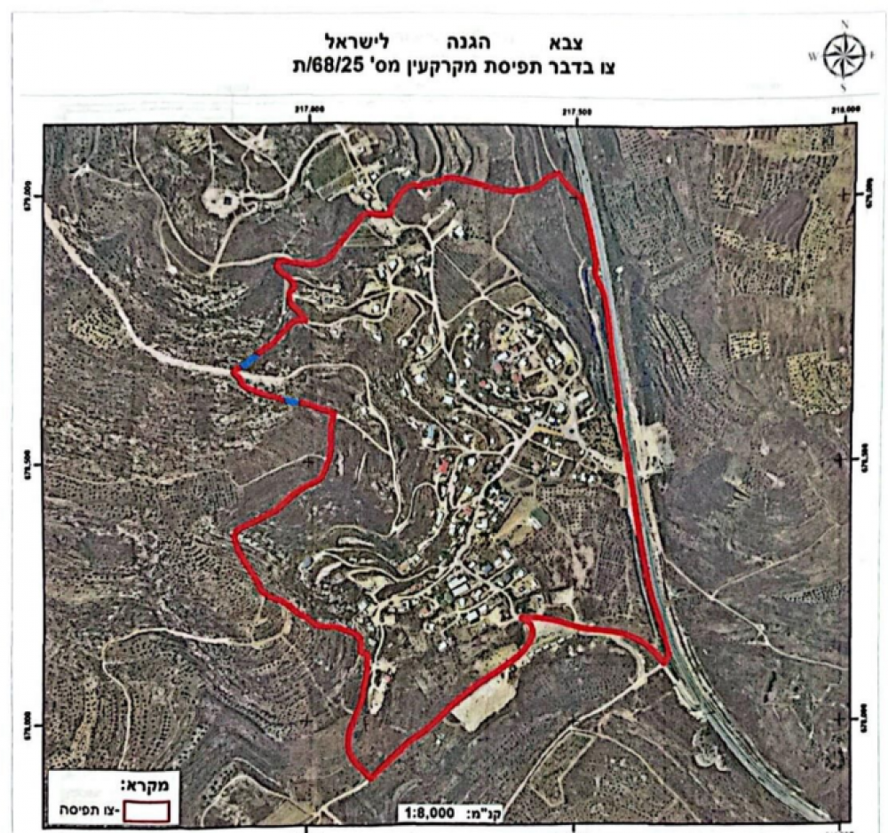 وقالت إن الأمر الثاني الذي حمل الرقم ت/38/25 استهدف ما مجموعه 4.821 دونمًا من أراضي حوارة في محافظة نابلس، وتحديدًا منطقتي النجمة القبلية والطول، وذلك بهدف إقامة سياج أمني محاذٍ للشارع.