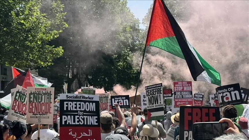 تظاهر عشرات الآلاف في العاصمة البريطانية لندن مطالبين بوقف هجمات "إسرائيل" على الفلسطينيين وعلى إيران.