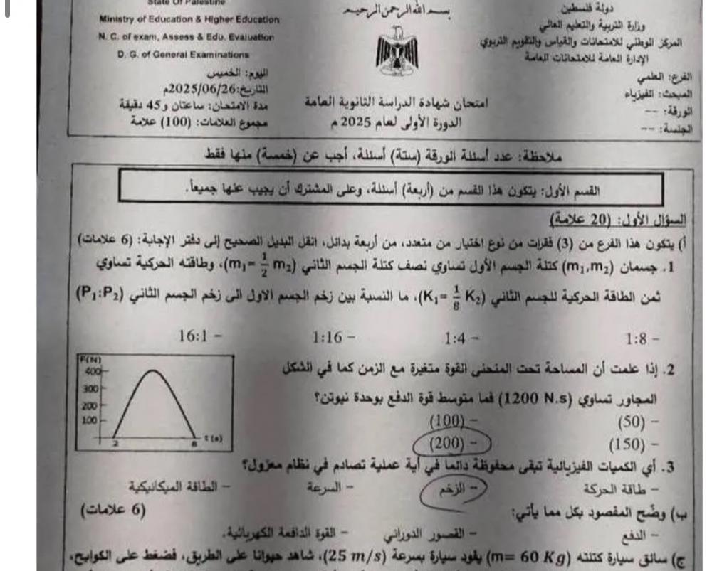 إجابات امتحان الفيزياء 2025 توجيهي فلسطين – تقدّم آلاف طلاب الثانوية العامة في فلسطين الثلاثاء، لامتحان الفيزياء ضمن امتحانات التوجيهي للعام 2025.