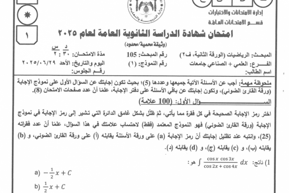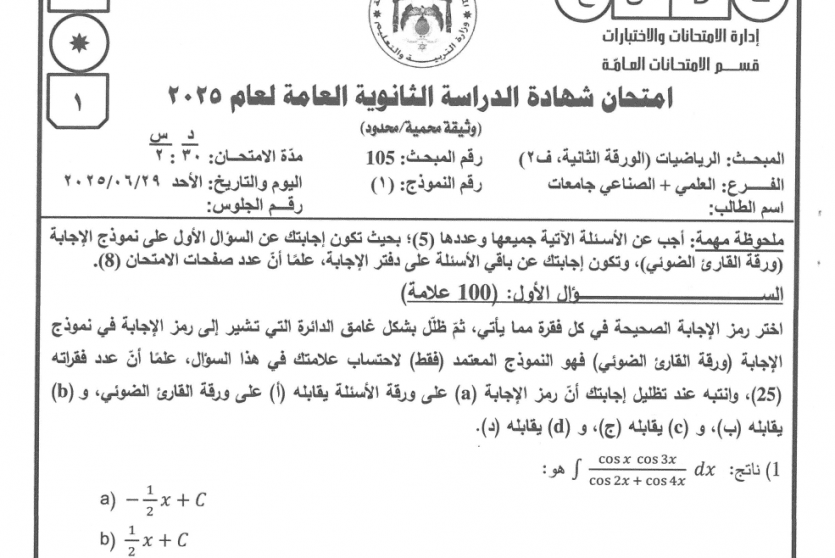 الأحد 29/6/2025: الرياضيات / الورقة الثانية