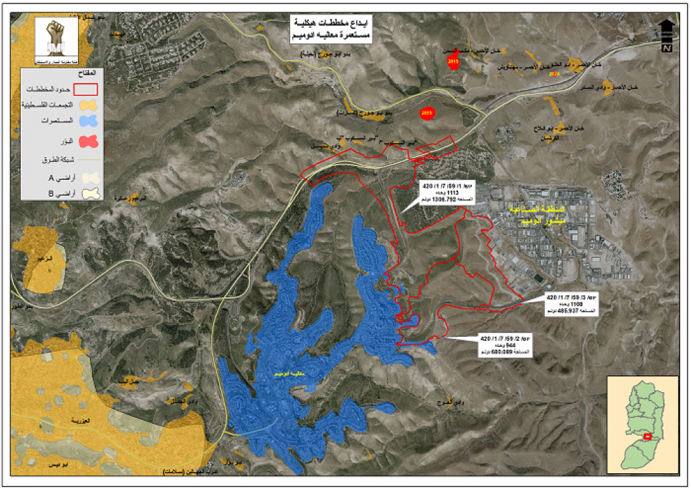 وأضاف أن المخططات الثلاث جاءت كالتالي، أولاً: "المخطط الهيكلي الذي يحمل الرقم יוש/ 1/ 59/ 7/ 1/ 420  لصالح مستعمرة "معاليه أدوميم"، ويهدف لبناء ما مجموعه 1113 وحدة استيطانية جديدة على مساحة تقدر بـ 1307 دونمات من أراضي المواطنين، في حين جاء المخطط الثاني والذي يحمل الرقم יוש/ 2/ 59/ 7/ 1/ 420 بهدف بناء 944 وحدة استيطانية على مساحة تقدر بـ 680 دونما، وتتحد مع المخطط الأول".