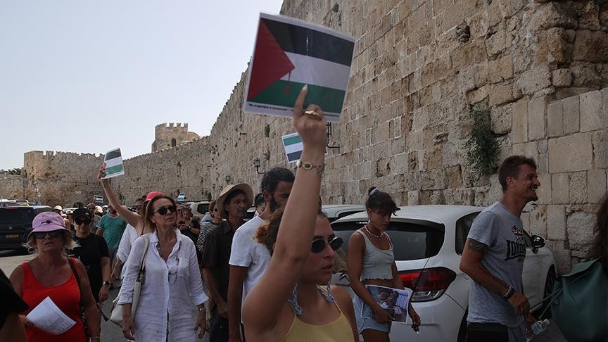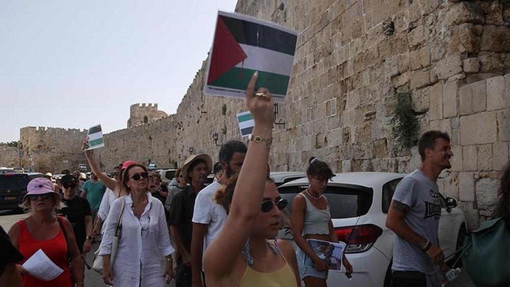 خرجت مظاهرة مؤيدة لفلسطين في ميناء جزيرة رودوس اليونانية تزامنا مع وصول سفينة سياحية إسرائيلية.