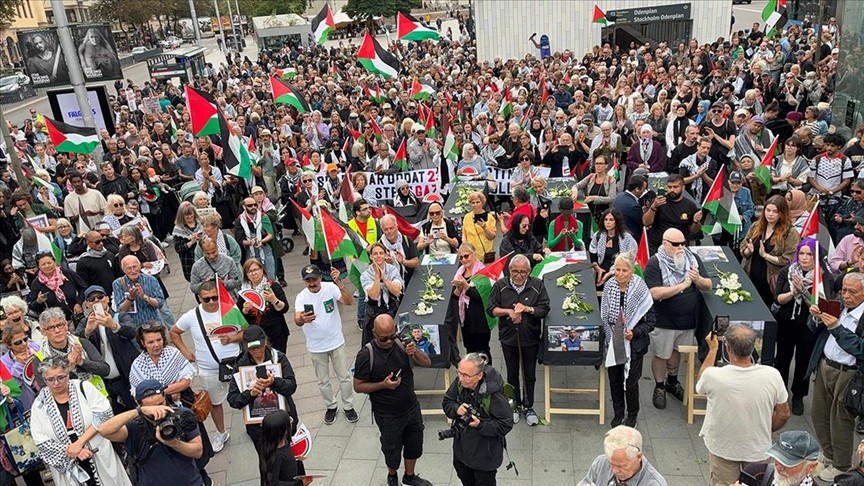 وحمل المتظاهرون لافتة كُتب عليها "الحرية لفلسطين، لا لخطة (بنيامين) نتنياهو و(دونالد) ترامب"، وتوجهوا لاحقًا إلى وزارة الخارجية السويدية.