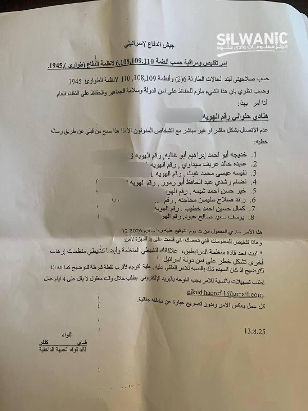 ويتضمن القرار الموقع من قائد "المنطقة الوسطى" في جيش الاحتلال، قائمة أسماء يمنع على الحلواني التواصل المباشر أو غير المباشر معهم، بزعم "المساس بأمن الدولة" وفق أوامر الطوارئ البريطانية لعام 1945.