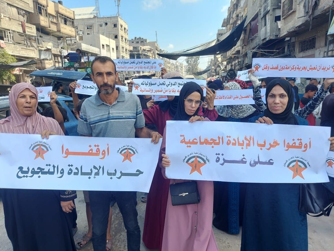 نظّمت الجبهة الديمقراطية لتحرير فلسطين، اليوم الخميس، وقفة جماهيرية في حي الشيخ رضوان شمالي مدينة غزة، تحت شعار: "صرخة لوقف حرب الإبادة الجماعية وفتح المعابر وإدخال احتياجات قطاع غزة".