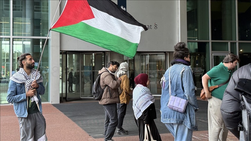 تظاهر عدد من الهولنديين أمام مقر وزارة الخارجية للمطالبة بوقف الهجمات بالطائرات المسيّرة والاعتداءات التي تستهدف "أسطول الصمود" العالمي المتجه إلى غزة لإيصال المساعدات الإنسانية.