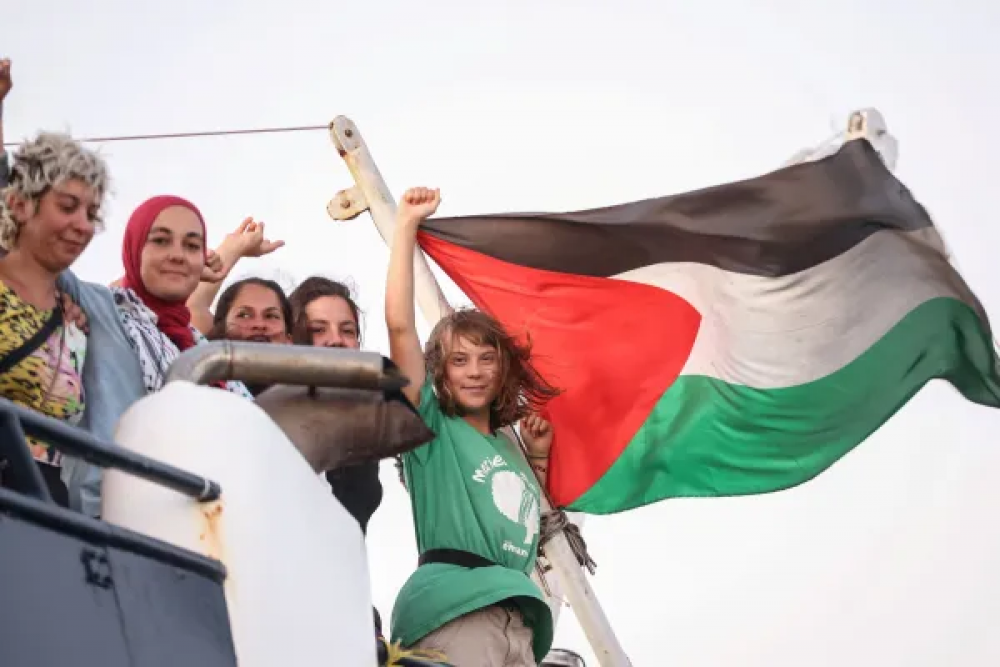 كانت ثونبرغ من بين 437 ناشطًا وبرلمانيًا ومحاميًا كانوا جزءًا من أسطول الصمود العالمي، وهو تحالف يضم أكثر من 40 سفينة تحمل مساعدات إنسانية وكان هدفها اختراق الحصار البحري الإسرائيلي الذي دام 16 عامًا على غزة.