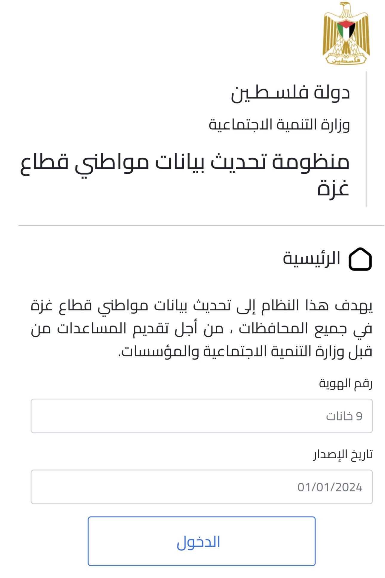 يهدف هذا النظام إلى تحديث بيانات مواطني قطاع غزة في جميع المحافظات، من أجل تقديم المساعدات من قبل وزارة التنمية الاجتماعية والمؤسسات.