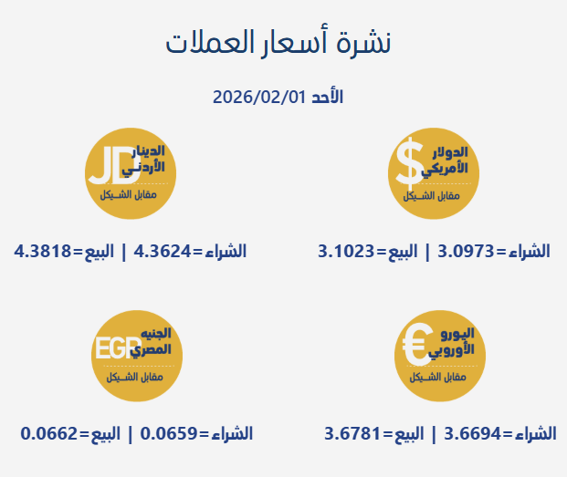 جاءت أسعار صرف العملات مقابل الشيقل الإسرائيلي، اليوم الاحد، بحسب سلطة النقد الفلسطينية، على النحو التالي: