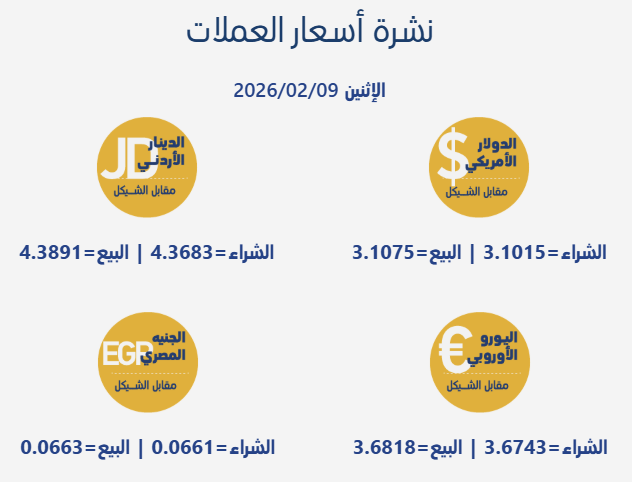 جاءت أسعار صرف العملات مقابل الشيقل الإسرائيلي، اليوم الإثنين، بحسب سلطة النقد الفلسطينية، على النحو التالي: