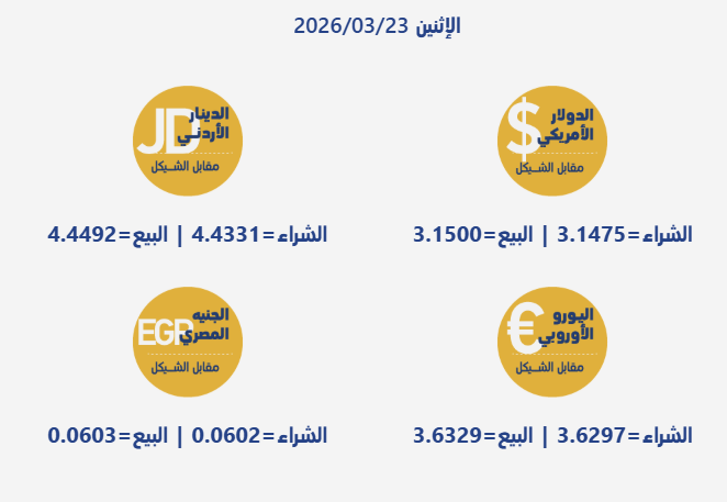 جاءت أسعار صرف العملات مقابل الشيقل الإسرائيلي، اليوم الإثنين، بحسب سلطة النقد الفلسطينية، على النحو التالي: