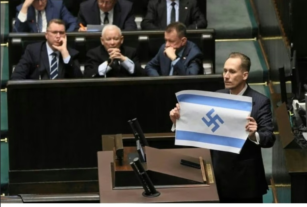 فجّر النائب البولندي كونراد بيركوفيتش جدلًا واسعًا داخل البرلمان، عندما رفع علمًا إسرائيليًا وضع عليه شعار "النازية"، متهمًا "إسرائيل" بارتكاب "إبادة جماعية بوحشية أمام أعيننا".