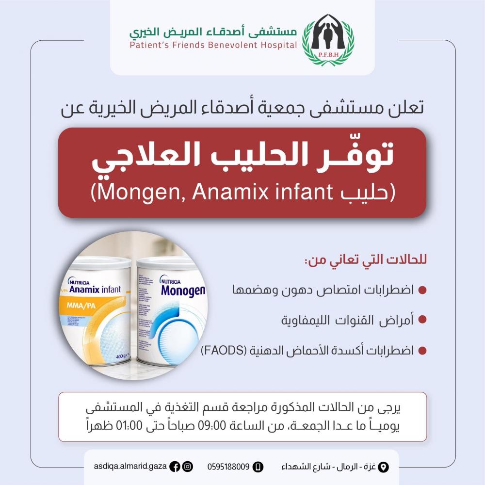 وأوضحت المستشفى أن الحليب المتوفر يشمل نوعي Mongen وAnamix Infant، وهما من المنتجات الطبية المخصصة لدعم الأطفال الذين يعانون من اضطرابات امتصاص وهضم الدهون، وأمراض القنوات الليمفاوية، إضافة إلى اضطرابات أكسدة الأحماض الدهنية (FAODS).